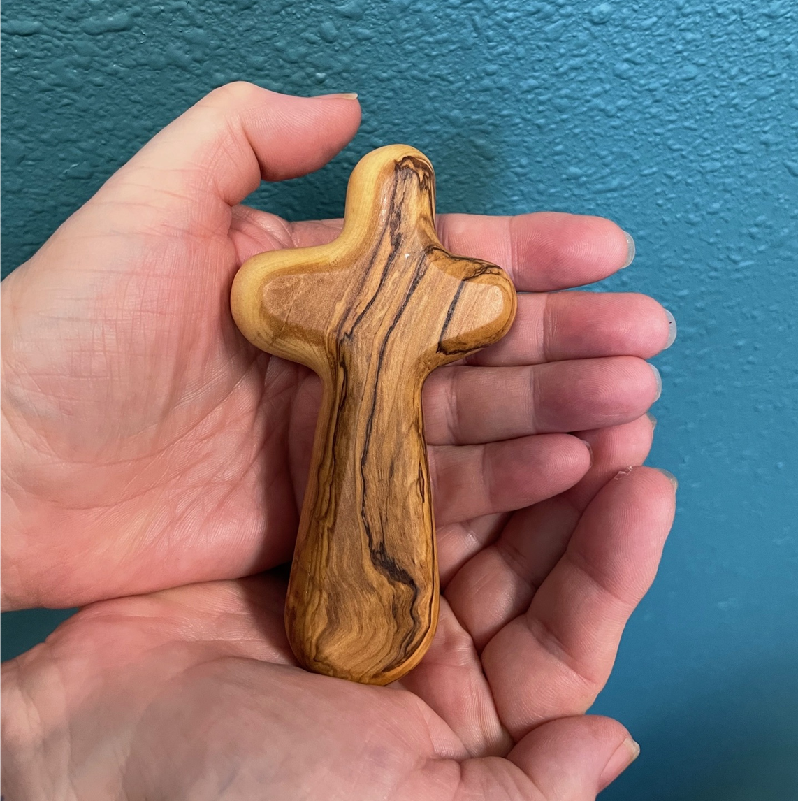 An individually hand-carved cross, made from a single unique piece of olive wood. The wood is pruned from the olive trees growing around Bethlehem.